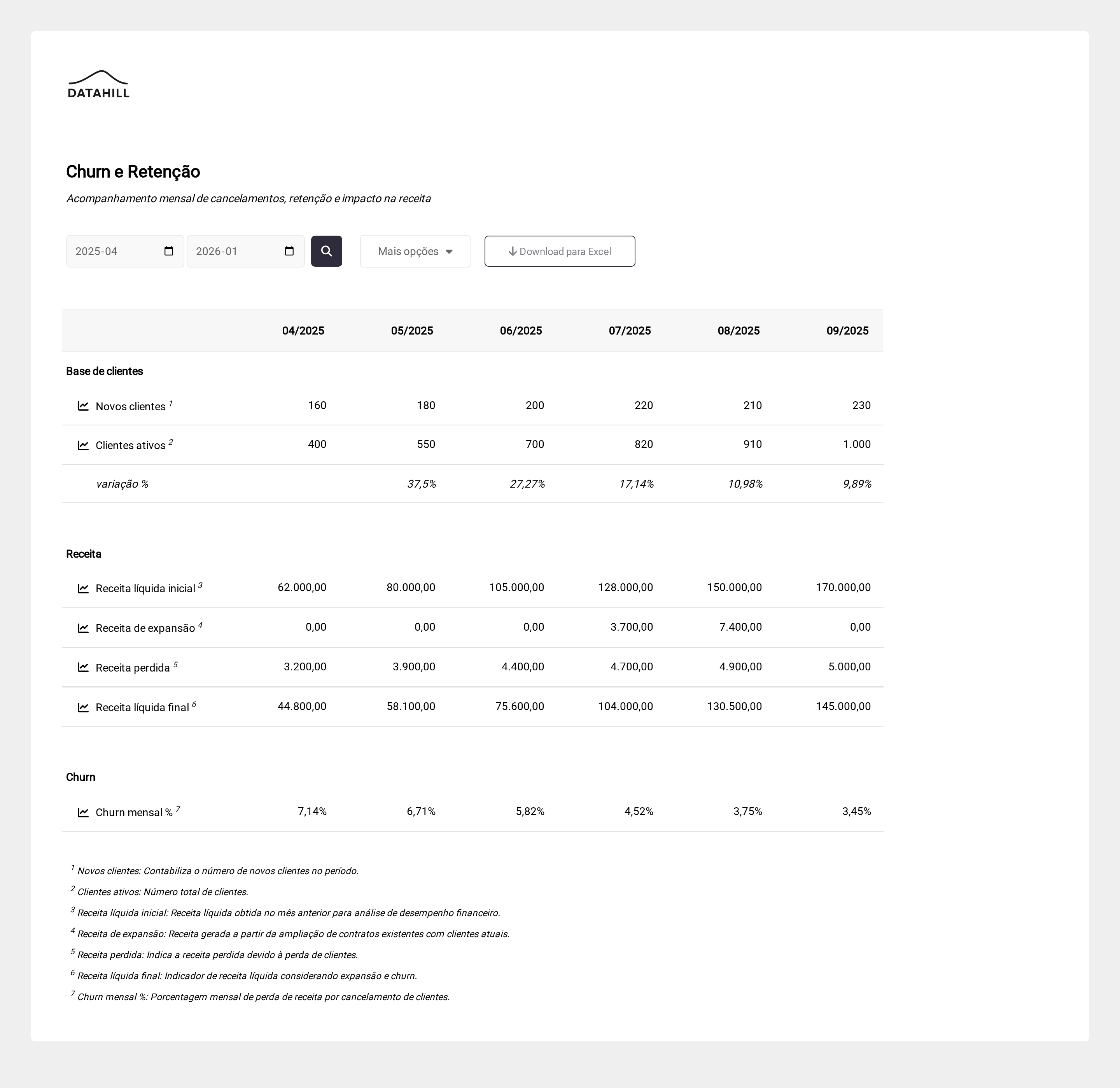 - Identificação de tendências: Permite identificar picos ou quedas no churn e investigar suas possíveis causas.